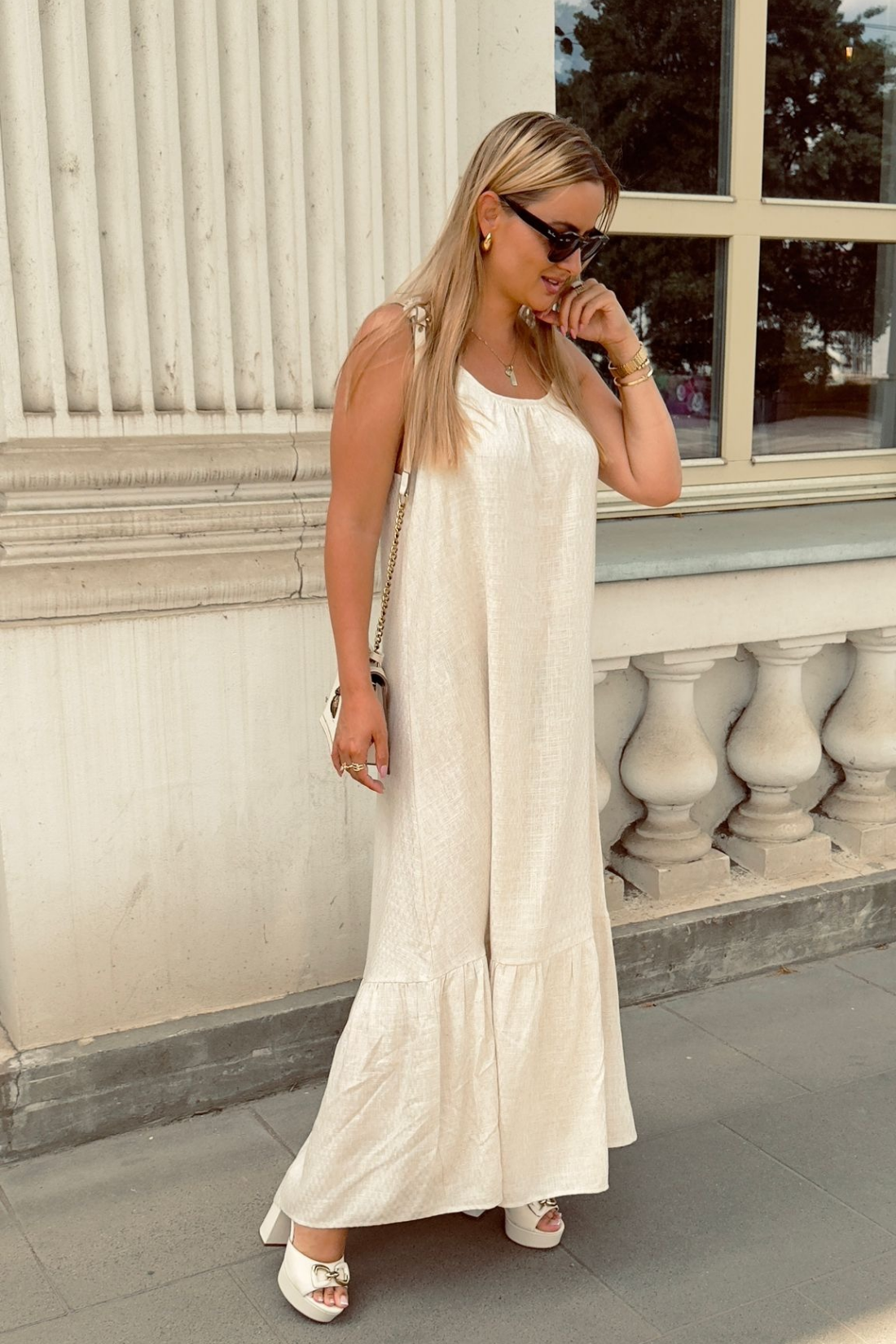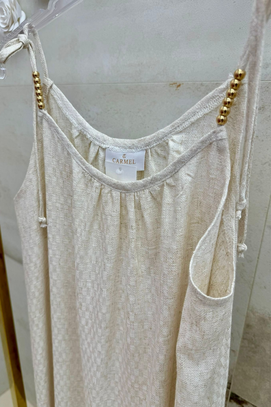 Luźniejszy fason sprawia, że sukienka pięknie układa się na sylwetce i jest odpowiednia dla różnych typów figury. Model posiada regulowane ramiączka ozdobione koralikami, które nadają całości wyjątkowego charakteru i pozwalają dopasować długość i ułożenie sukienki do własnych preferencji.