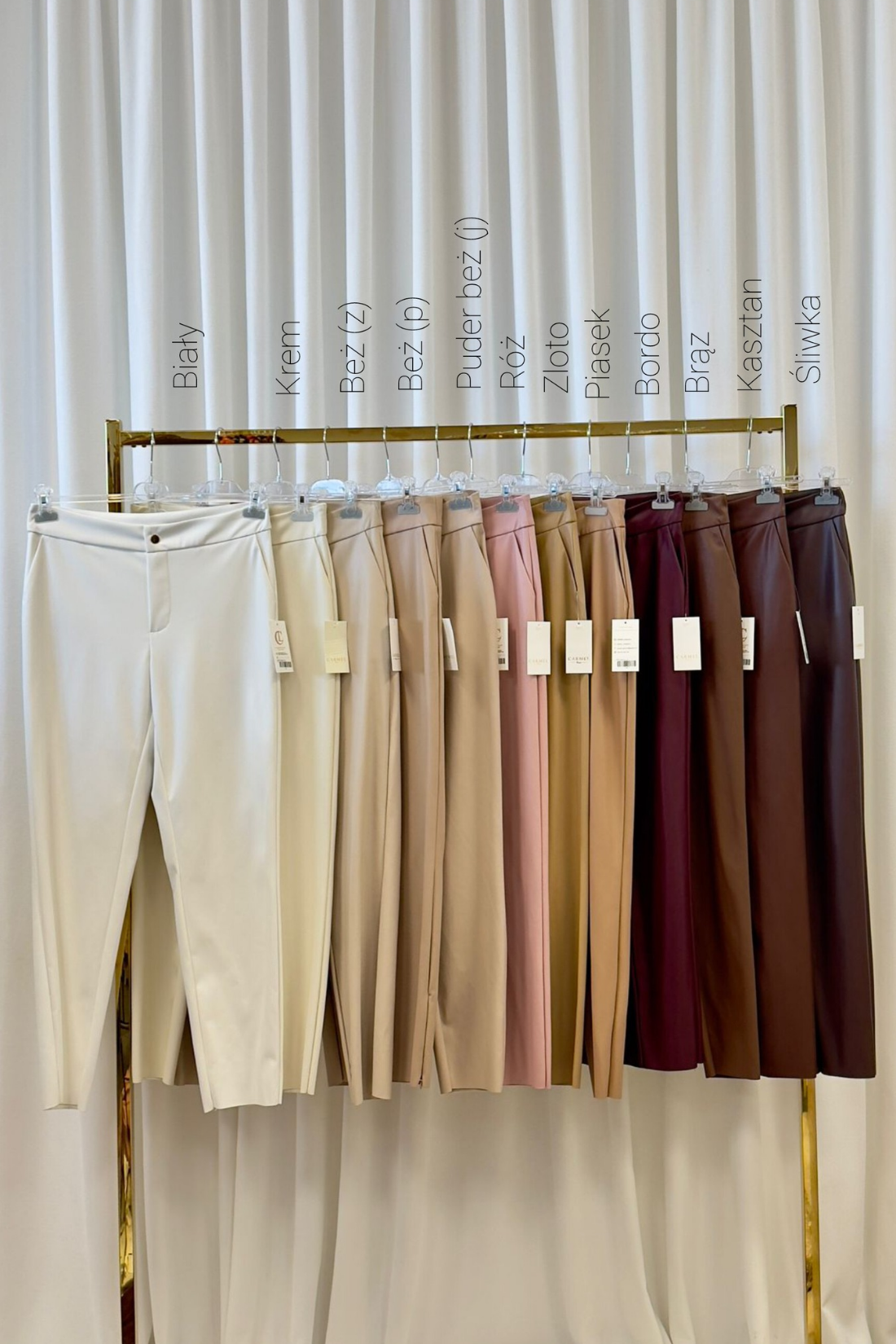 Model ma prosty krój cygaretek, dzięki czemu optycznie wydłuża nogi i sprawdza się w wielu stylizacjach — od eleganckich po bardziej casualowe. Spodnie zapinane są na zamek z ozdobną złotą napą, co podkreśla ich luksusowy charakter.