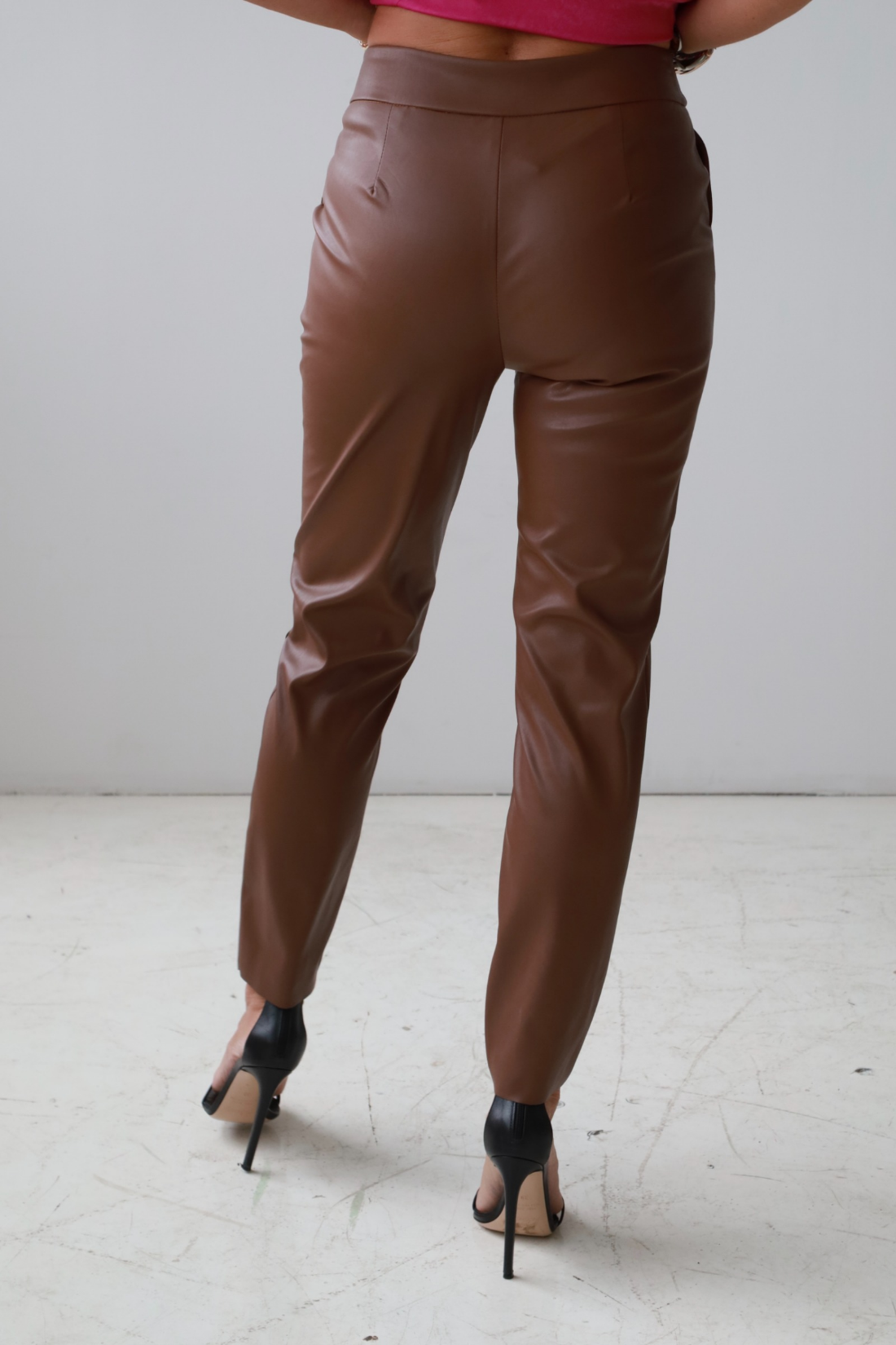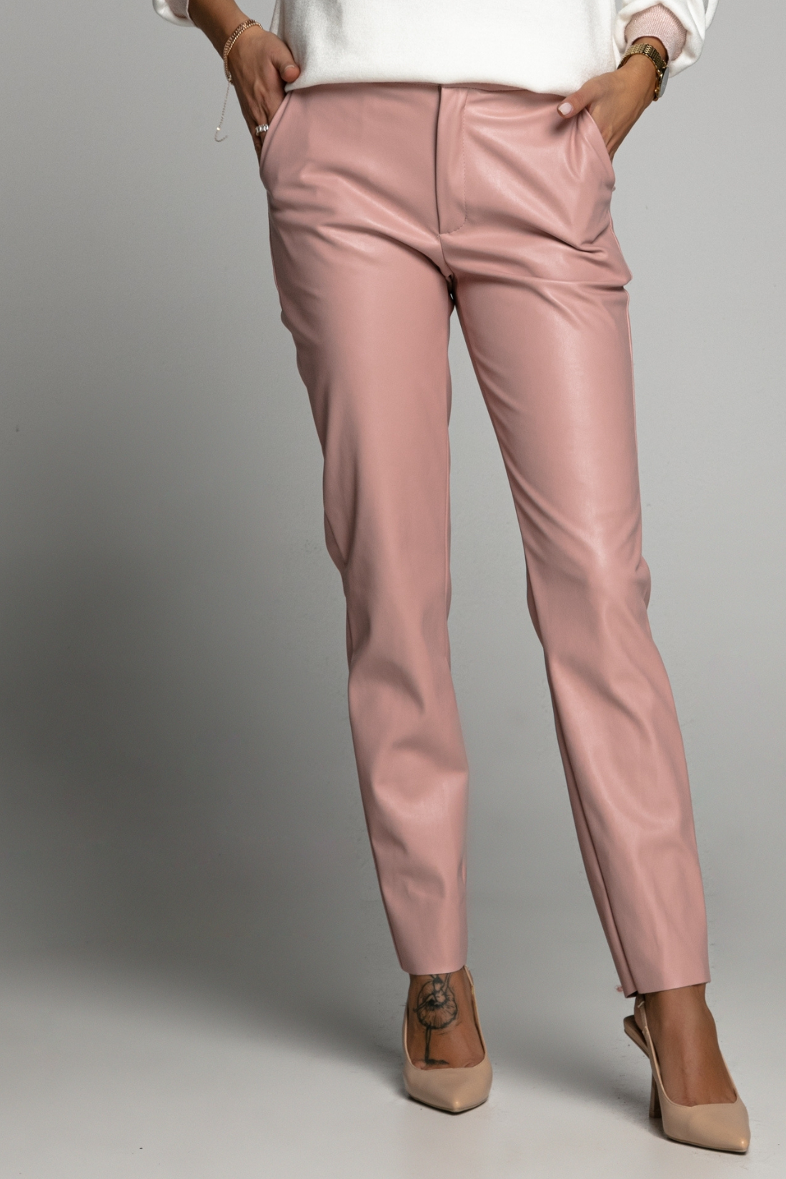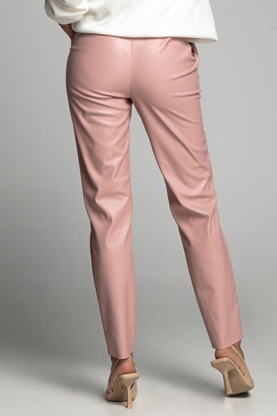 Spodnie Tiffi wykonane są z miękkiej, wysokiej jakości eko skóry o delikatnie zamszowej strukturze, która wygląda i zachowuje się jak prawdziwa skóra, ale pozostaje w pełni wegańska. Materiał jest elastyczny, nie szeleszczy i komfortowo układa się na sylwetce, dając efekt drugiej skóry.