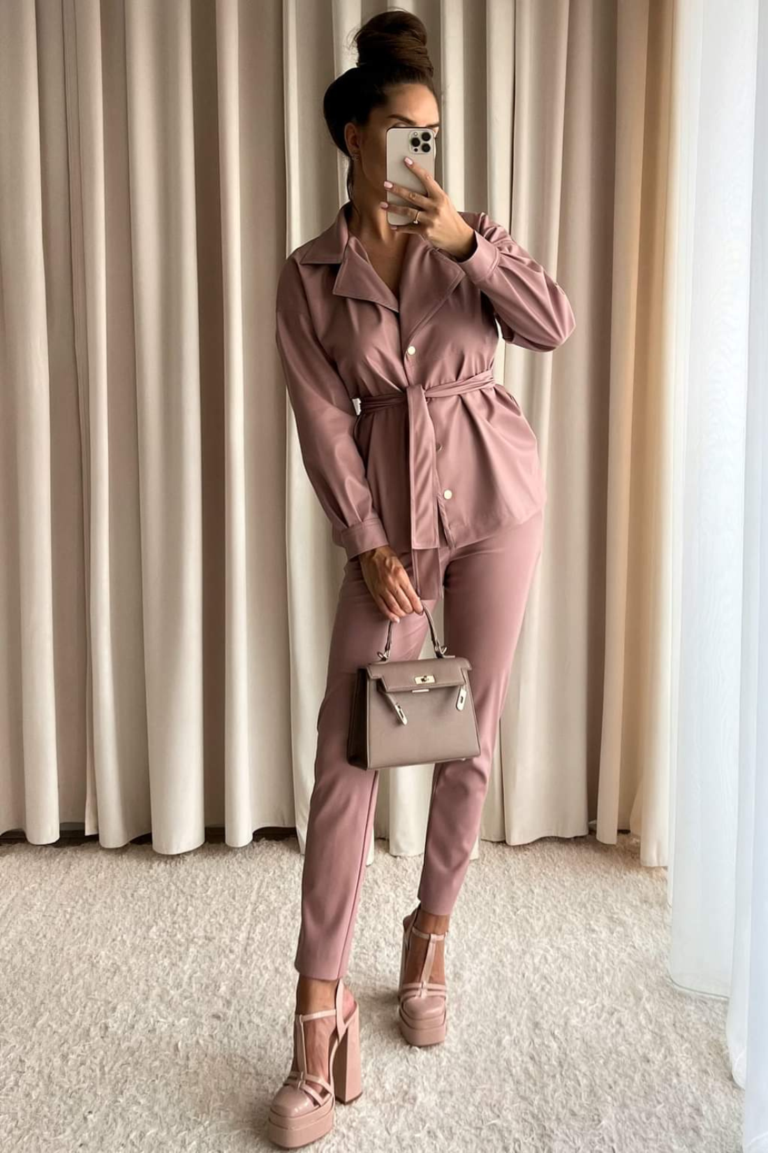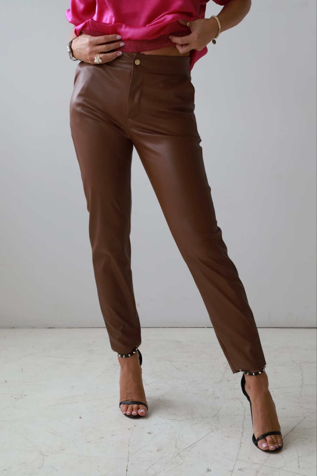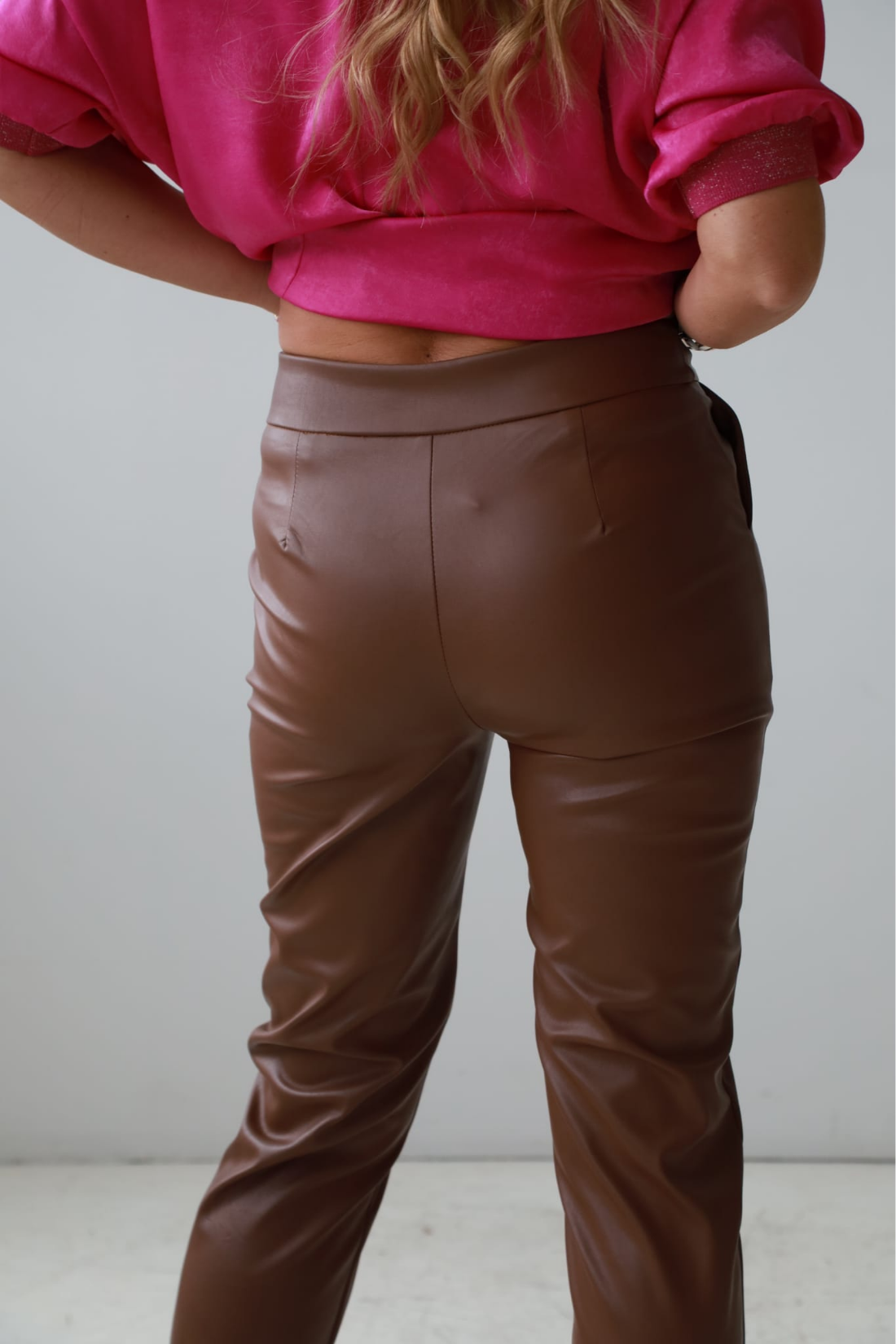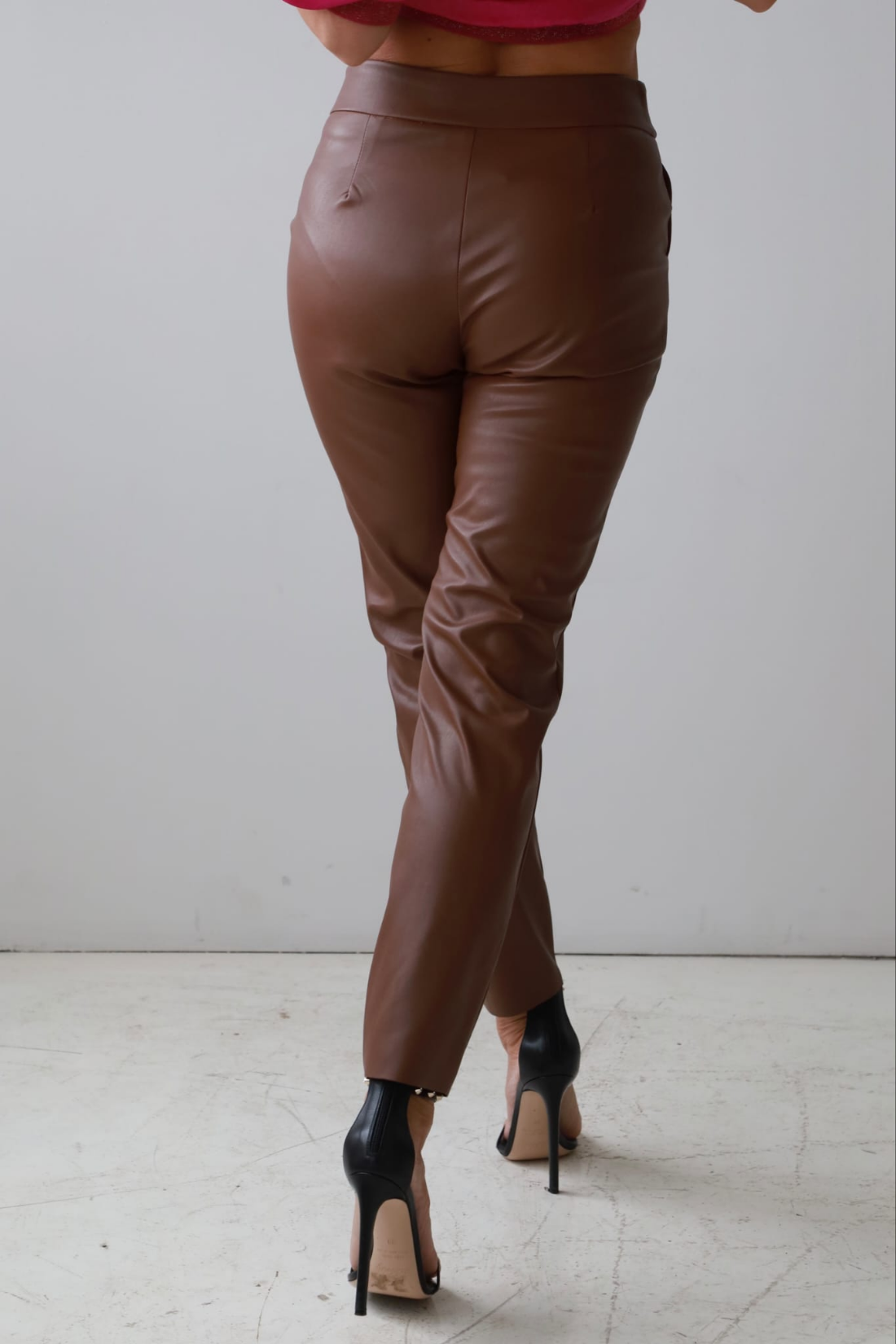 Spodnie Tiffi wykonane są z miękkiej, wysokiej jakości eko skóry o delikatnie zamszowej strukturze, która wygląda i zachowuje się jak prawdziwa skóra, ale pozostaje w pełni wegańska. Materiał jest elastyczny, nie szeleszczy i komfortowo układa się na sylwetce, dając efekt drugiej skóry.