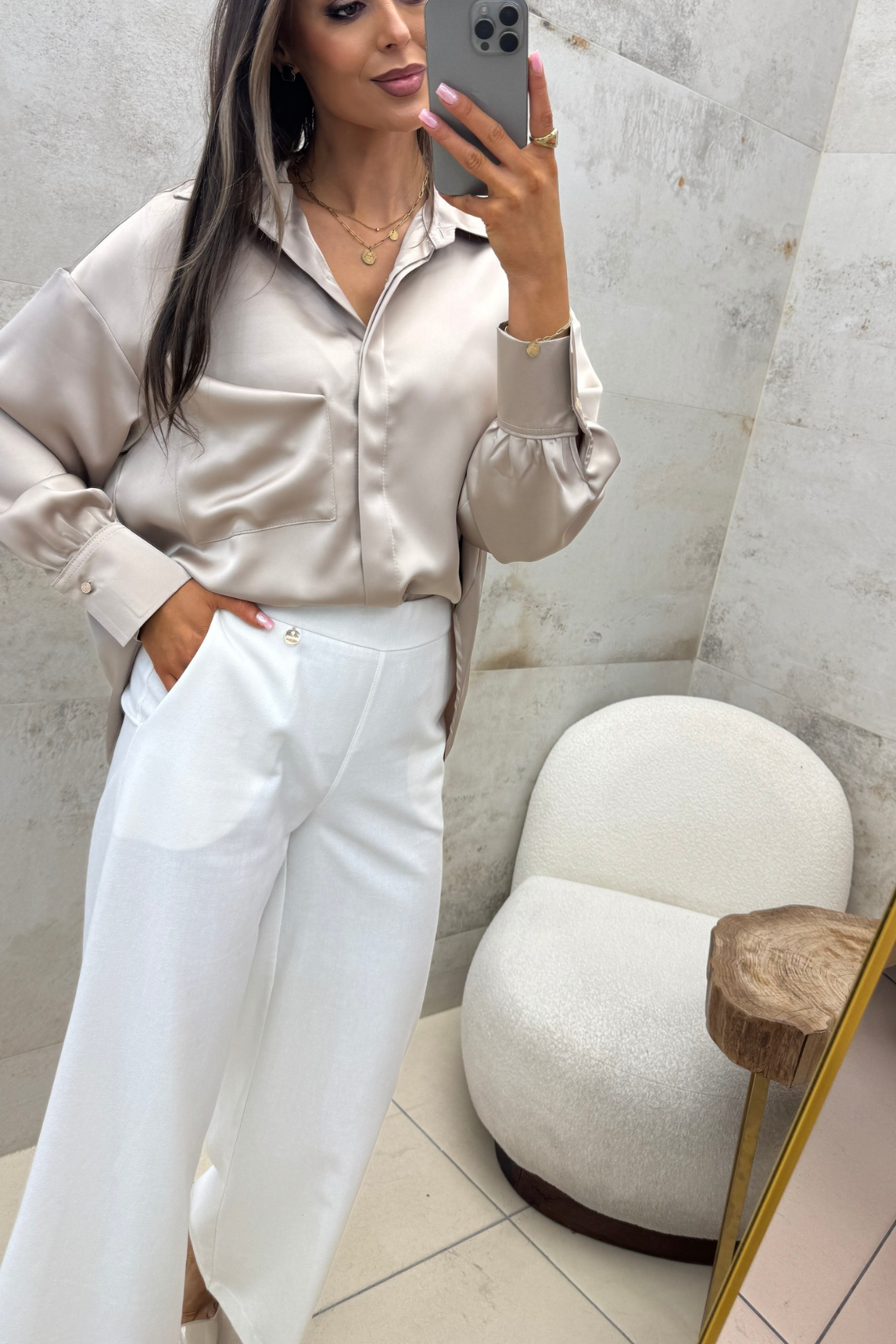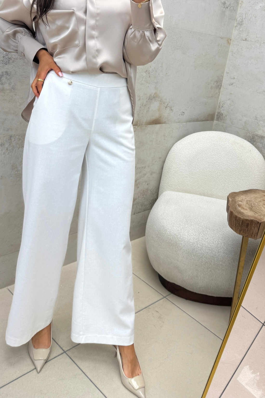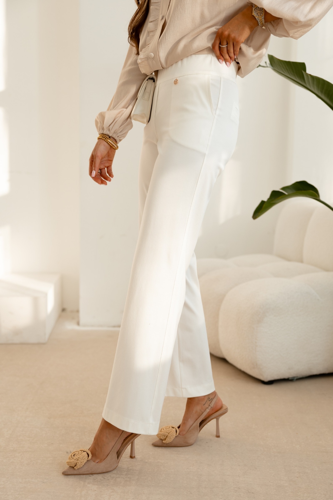 Spodnie Viva to odświeżona wersja kultowego modelu Gold — teraz w formie szerszych nogawek bez kantów, które nadają sylwetce lekkości i nowoczesnego charakteru. Uszyte z wysokiej jakości cienkiej włoskiej tkaniny z dodatkiem wiskozy, są miękkie, przewiewne i delikatnie elastyczne, zapewniając pełen komfort noszenia.