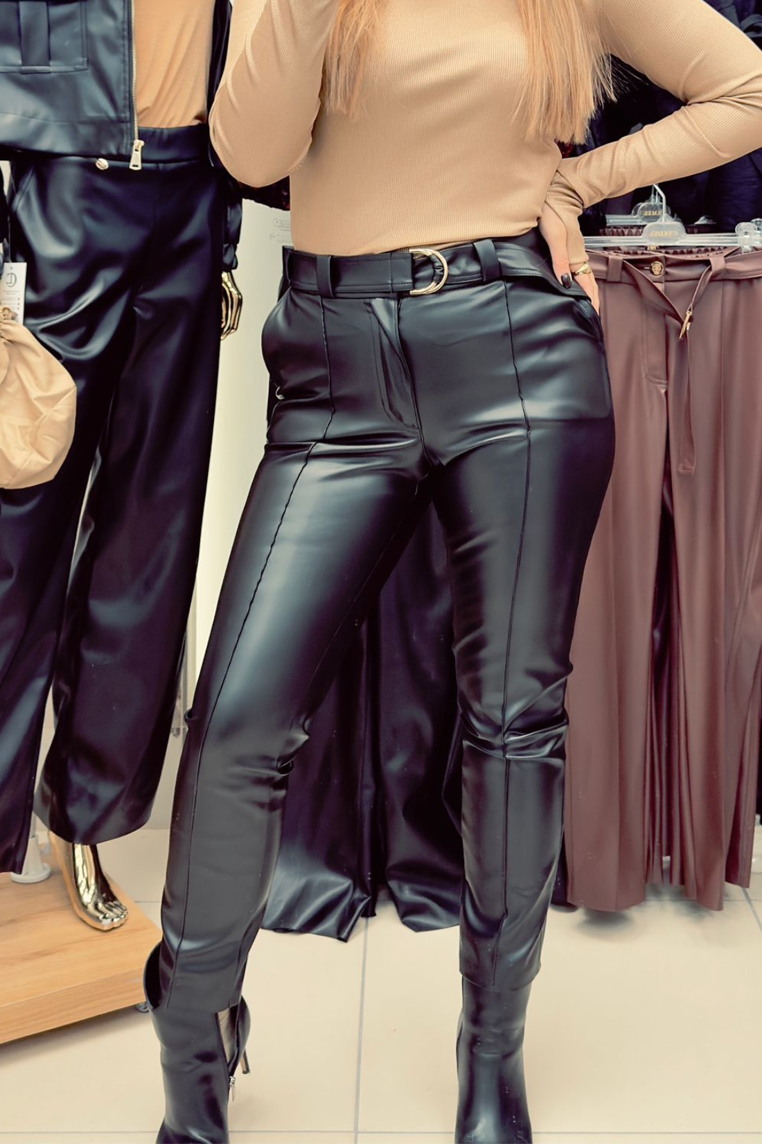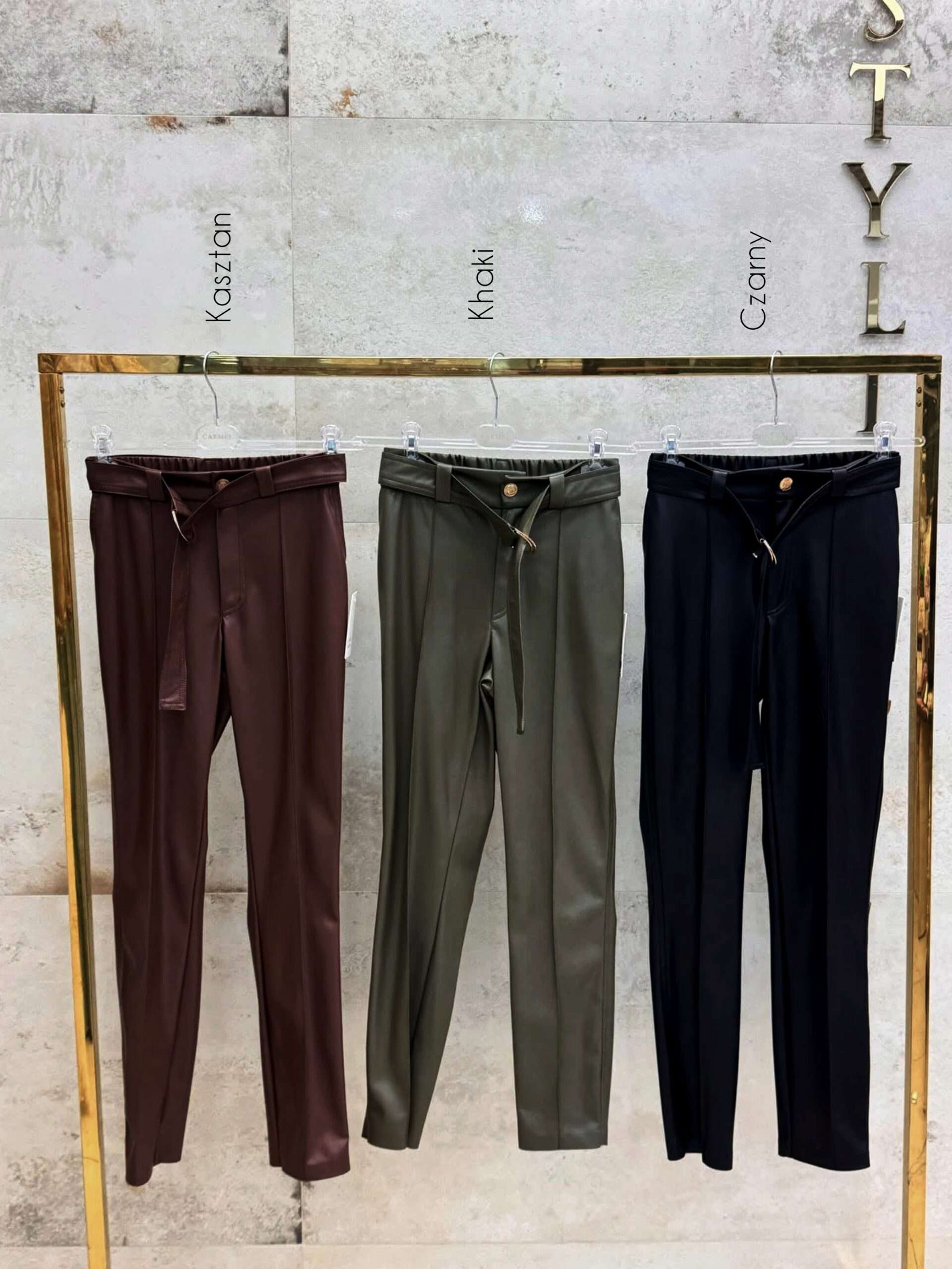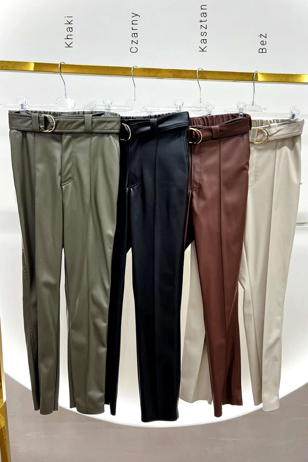 Spodnie Santi to limitowany hit kolekcji, wykonany z miękkiej wegańskiej eko skóry najwyższej jakości. Materiał jest elastyczny, przyjemny w dotyku, wygląda jak naturalna skóra, a jednocześnie nie szeleszczy i dopasowuje się do sylwetki.