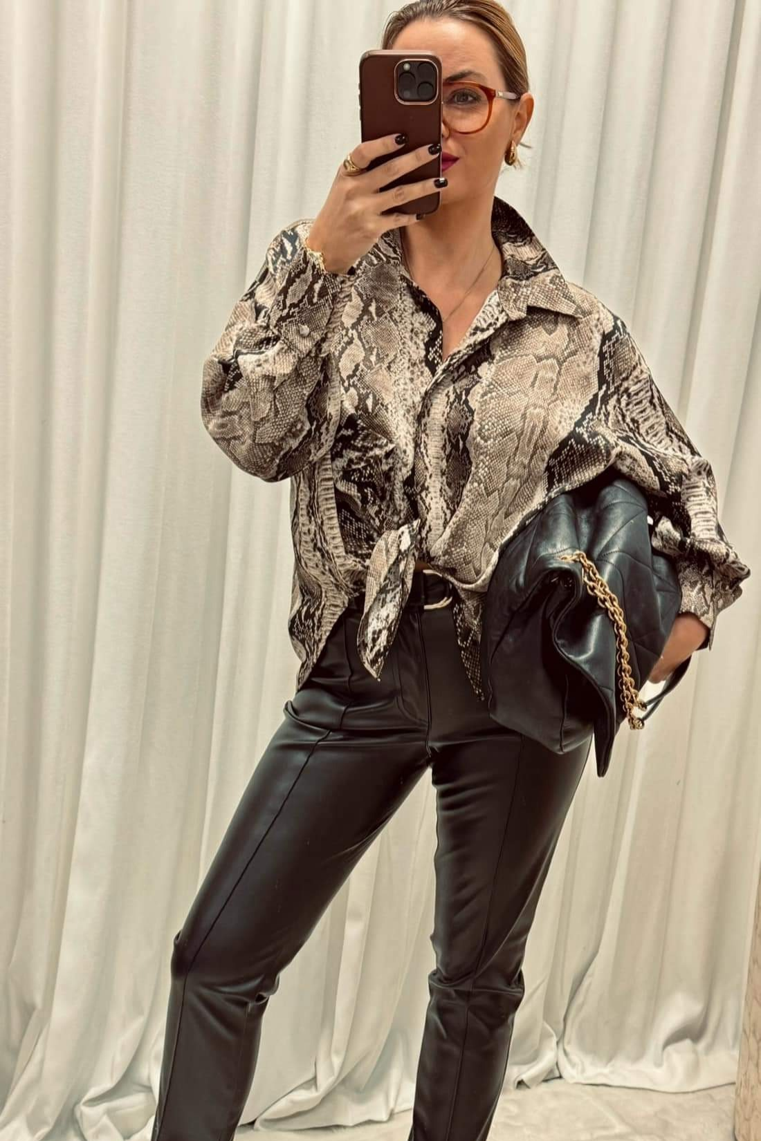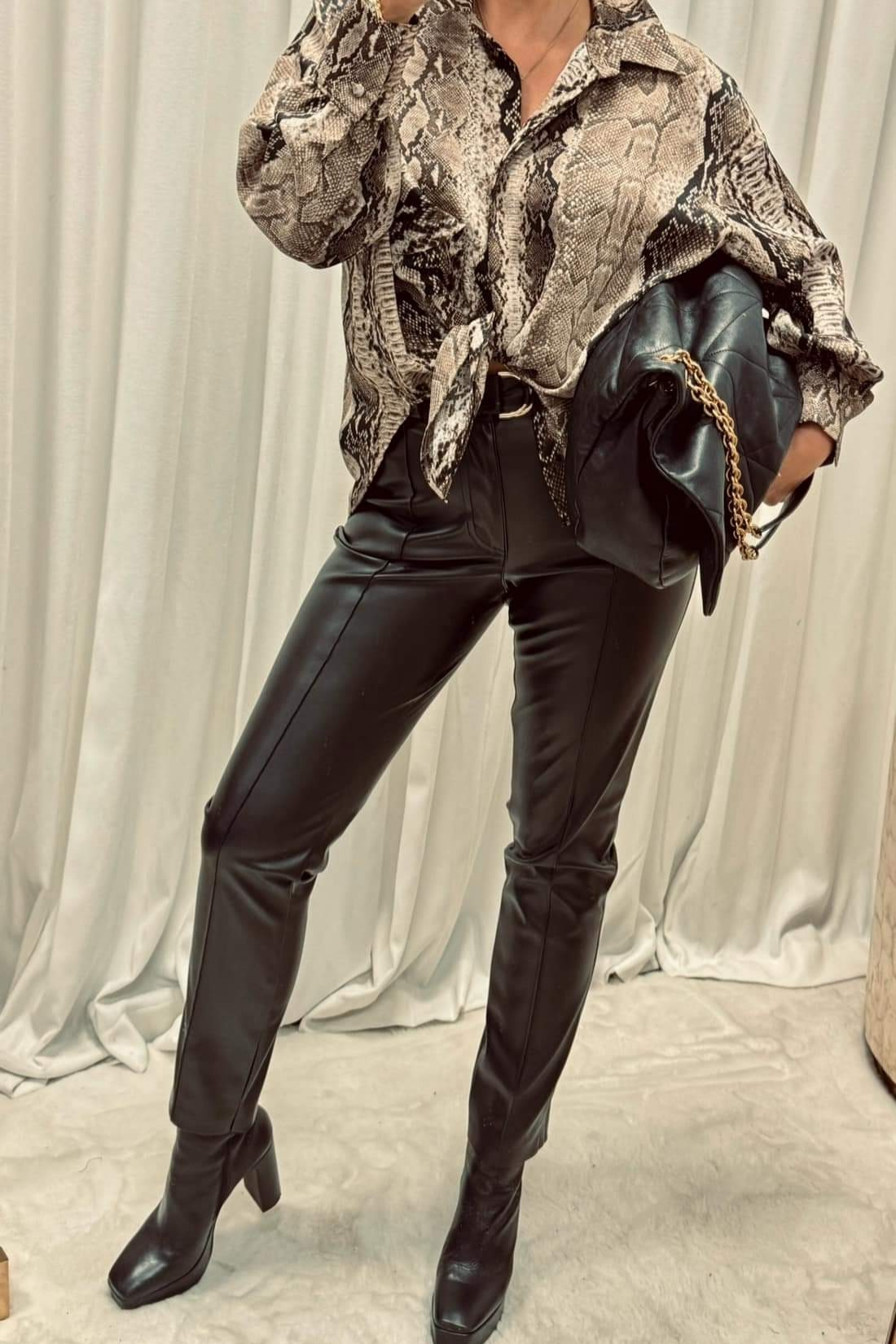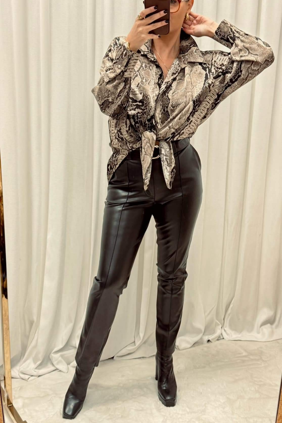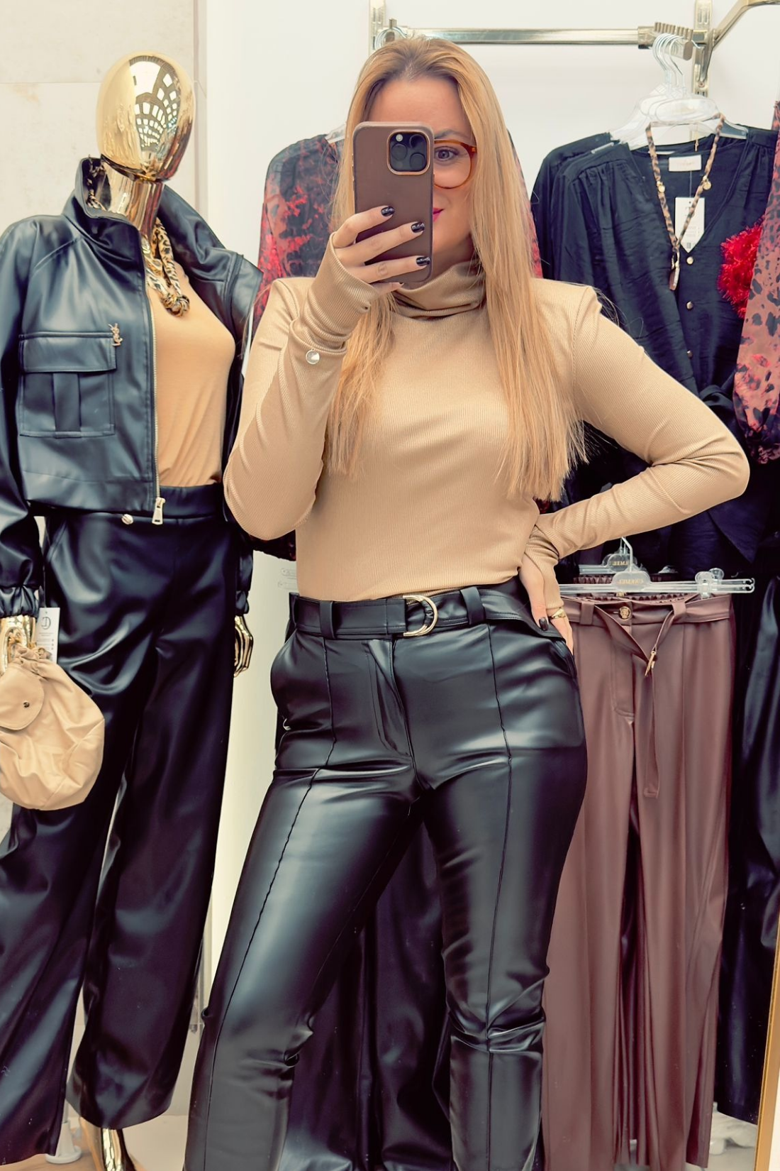 Spodnie Santi to limitowany hit kolekcji, wykonany z miękkiej wegańskiej eko skóry najwyższej jakości. Materiał jest elastyczny, przyjemny w dotyku, wygląda jak naturalna skóra, a jednocześnie nie szeleszczy i dopasowuje się do sylwetki.